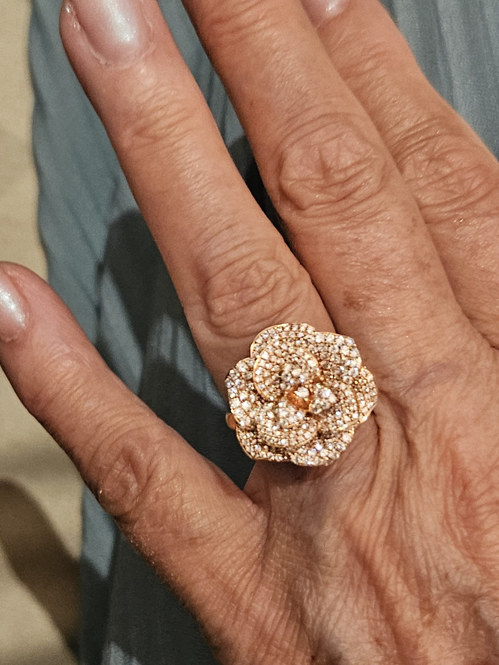 Bague fleur en or rose et jaune 18K, sertie d’un pavage de diamants. Poids: 9,6 g.