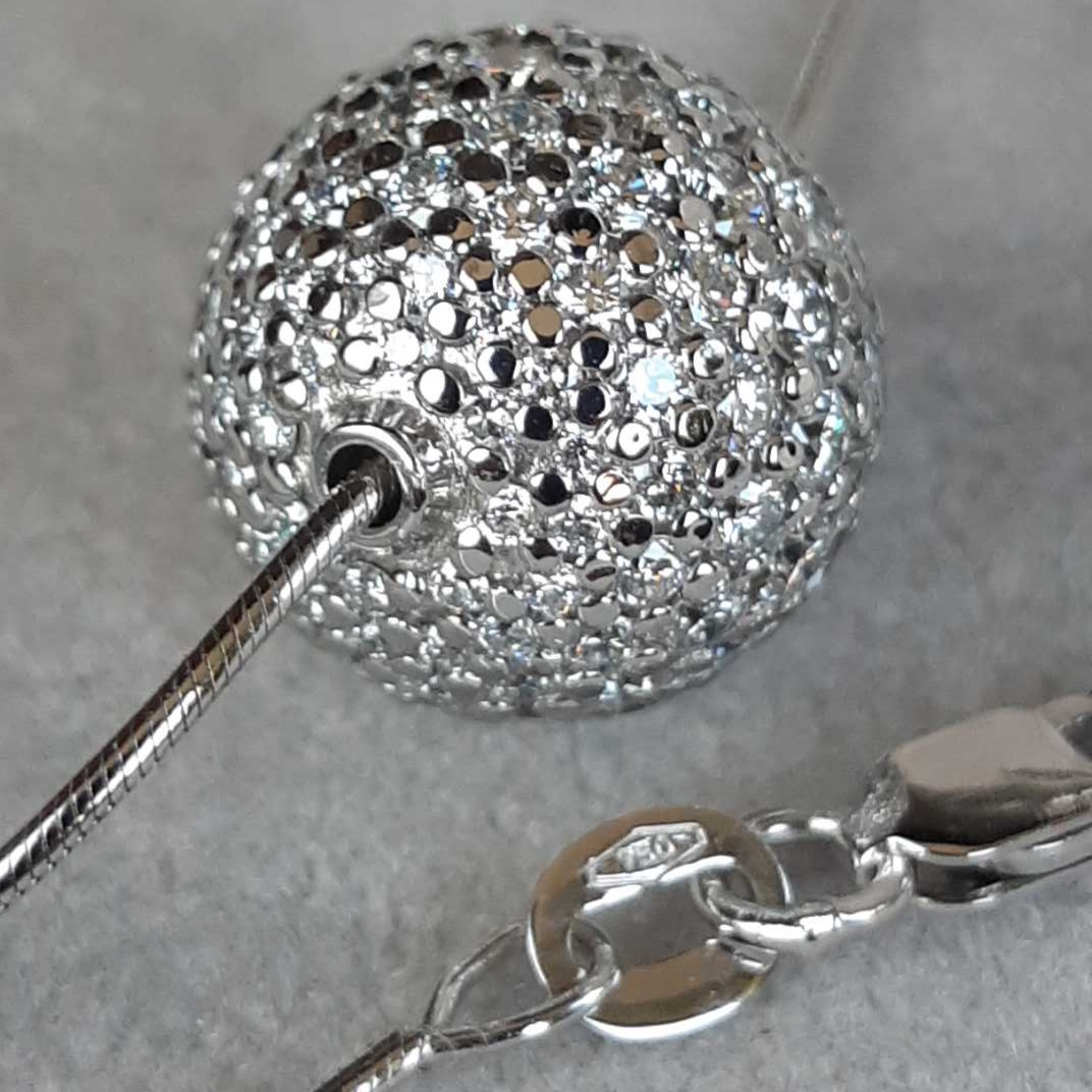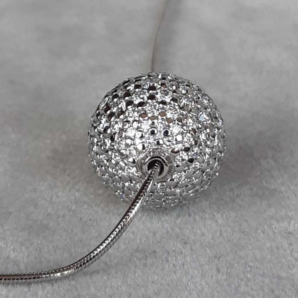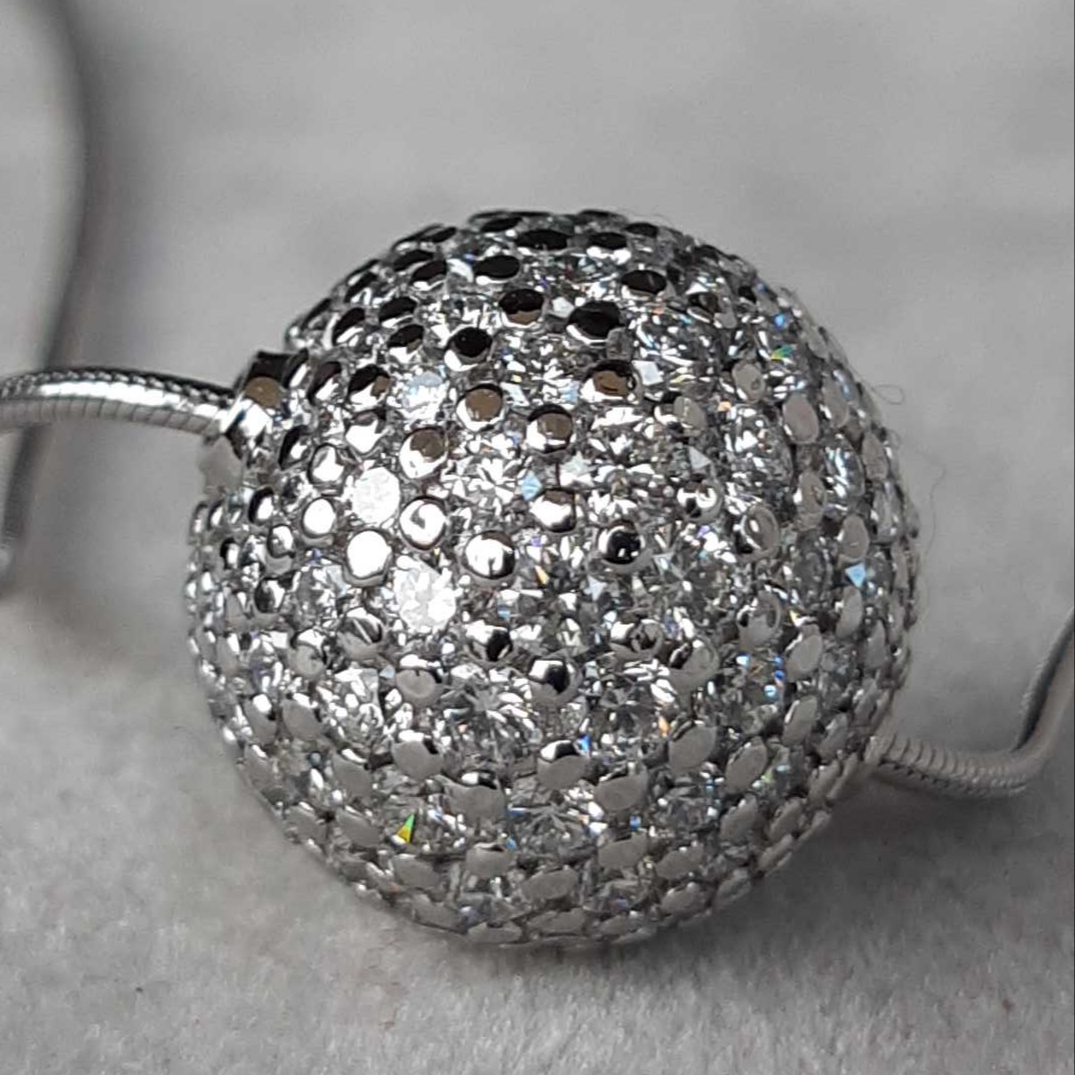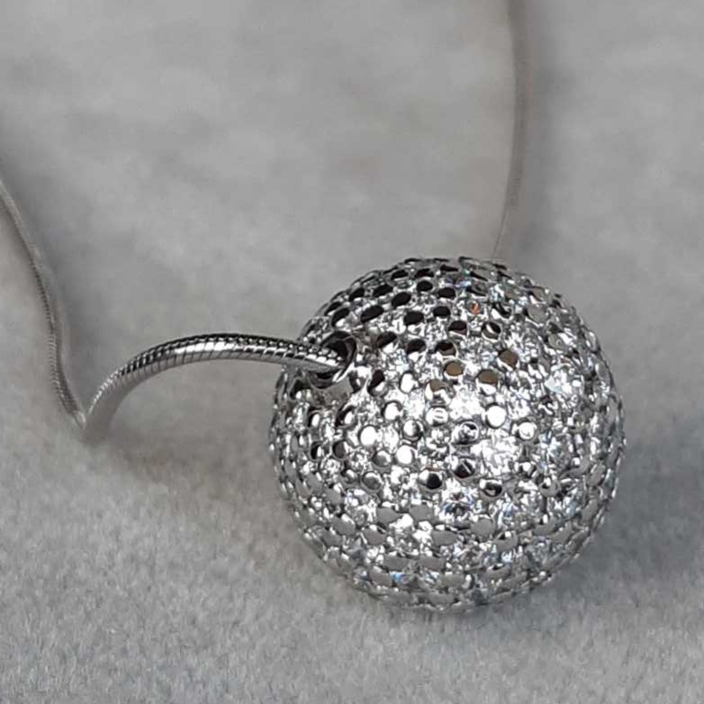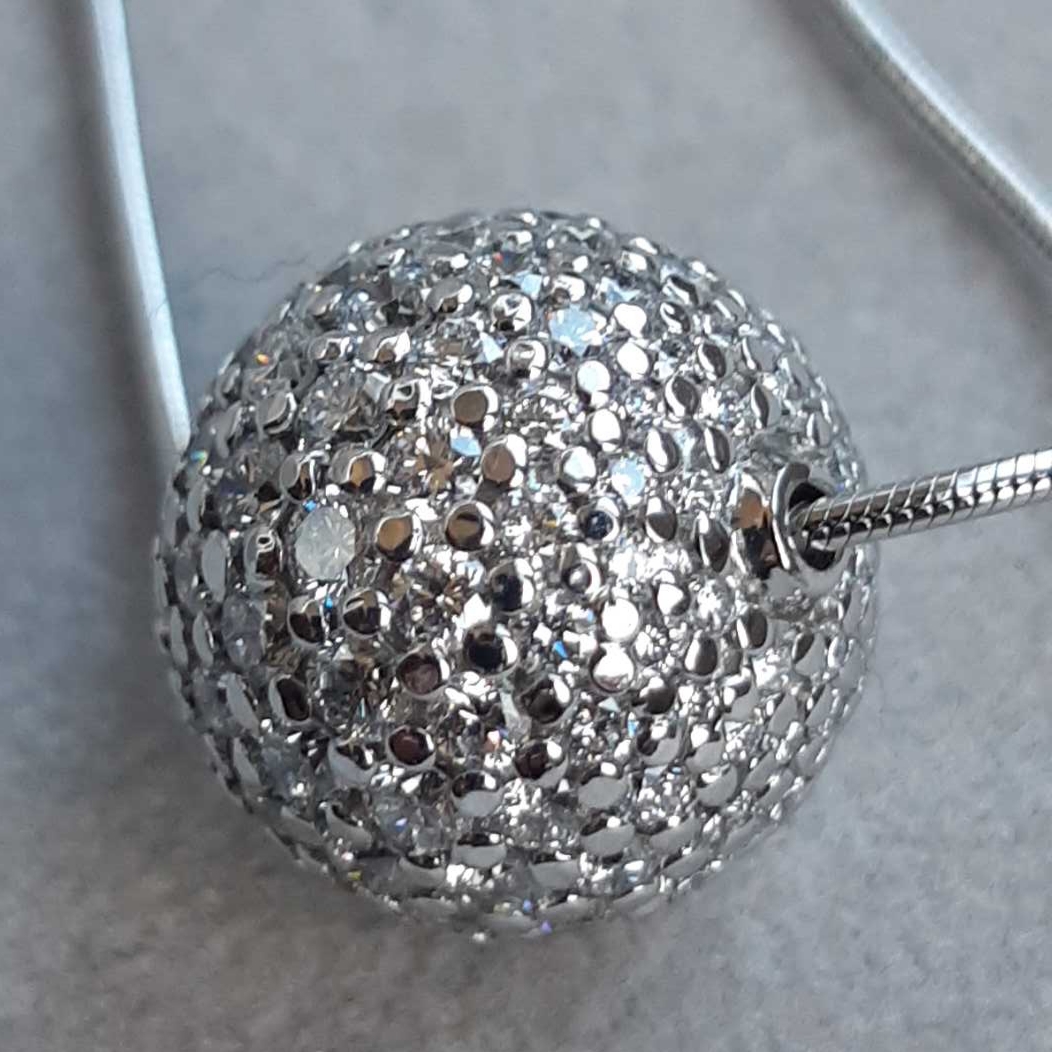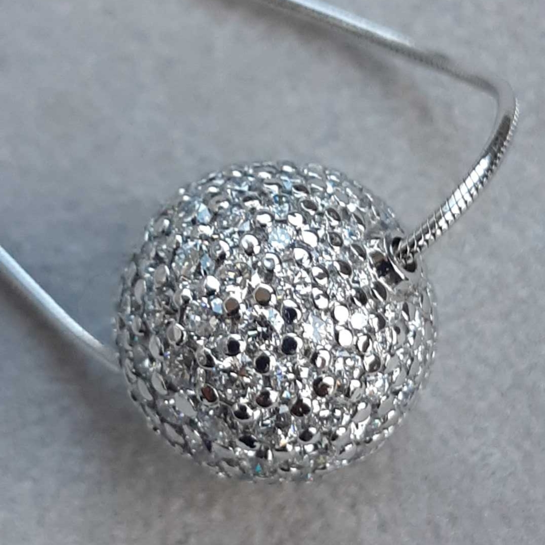Collier en or blanc 18 karats (750‰), composé d’une chaîne et d’un pendentif sphérique entièrement pavé de diamants taillés brillants.