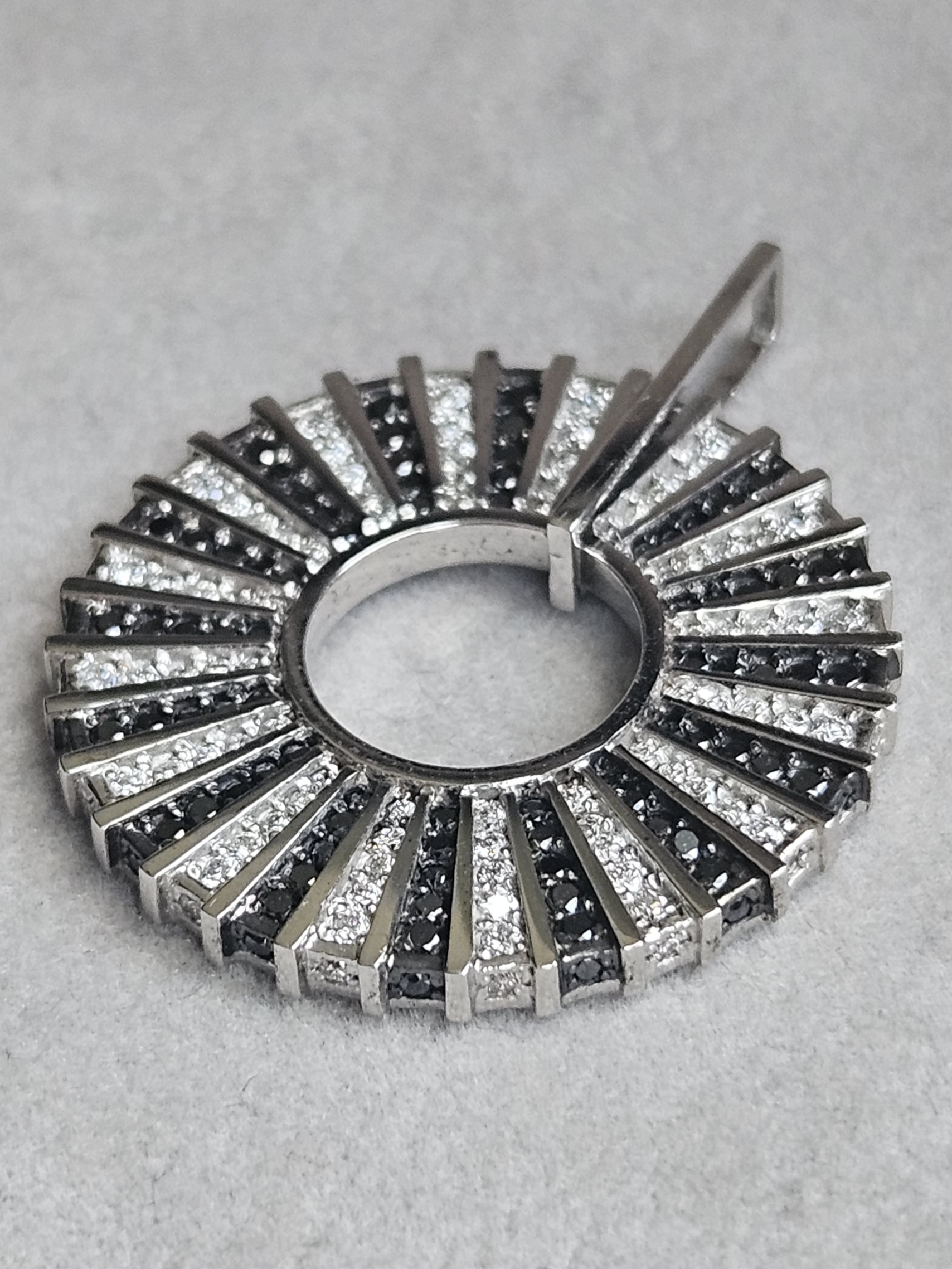 Grand pendentif circulaire ajouré en or blanc 18 karats (750‰), orné en alternance de diamants naturels blancs et noirs taillés brillant. Poids: 8,4 g.